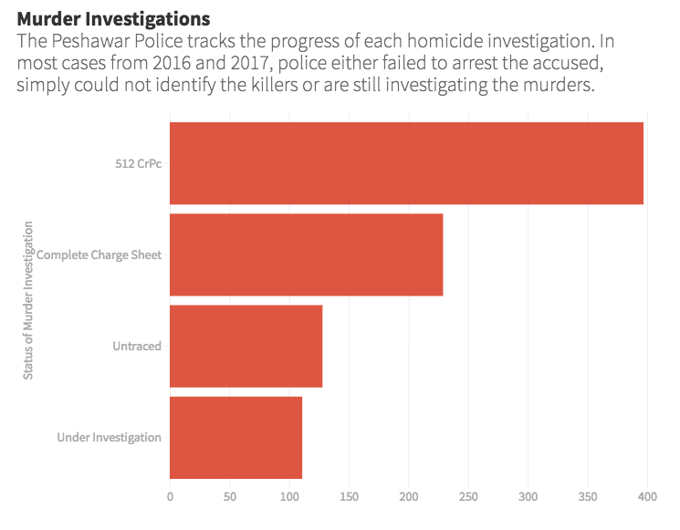 In addition to the 397 murder cases with the 512 CrPc status, 128 homicides in Peshawar district were untraced between January 2016 and December 2017. Another 111 cases from the same time period are still under investigation.