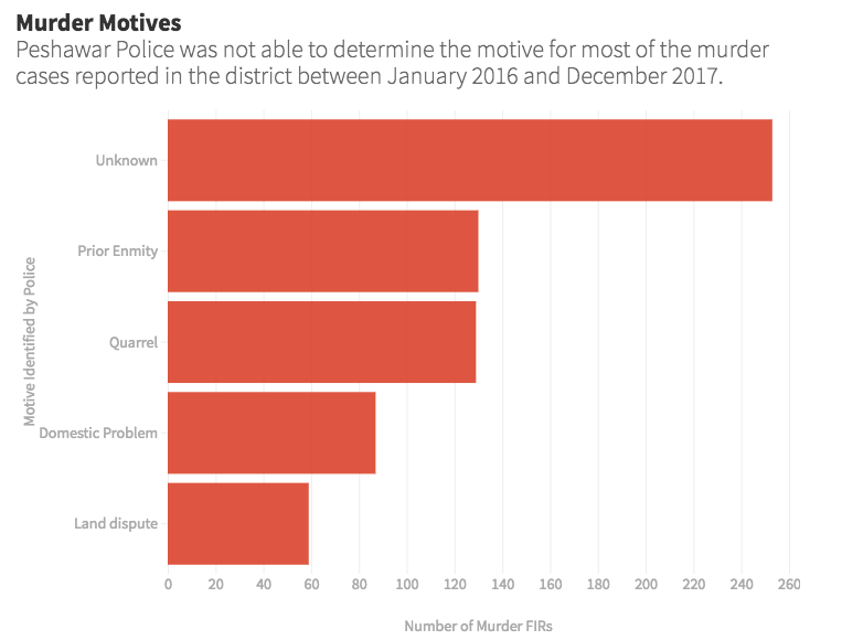 The police registered 880 First Information Reports (FIRs) for murder from January 2016 to December 2017 at 30 police stations in Peshawar. According to police records, the accused either absconded or police were unable to trace the killers in at least 60% of these homicide investigations.