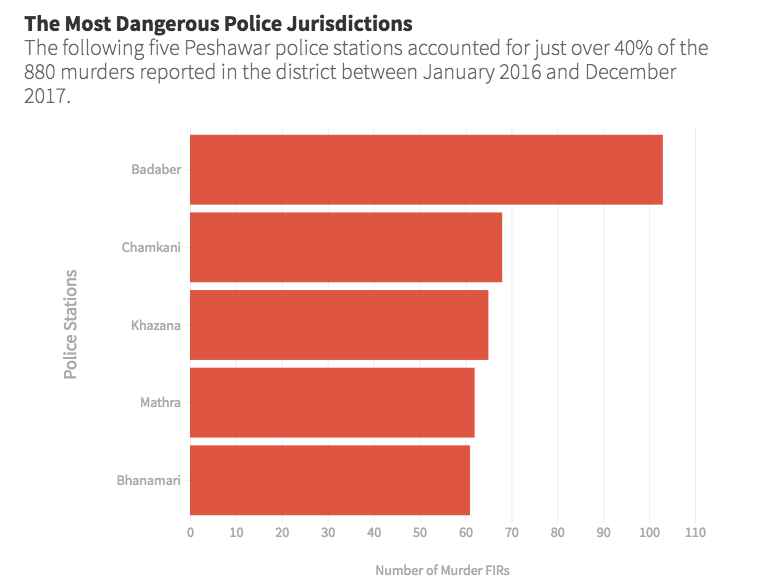 Under-reported crimes might skew district comparisons. But, in absolute terms, the Peshawar district saw an alarming eight murders reported to police every week on average during the two years reflected in the data.